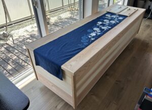低コストの県産杉の棺おけ、国産杉の骨壺も一緒に展示!