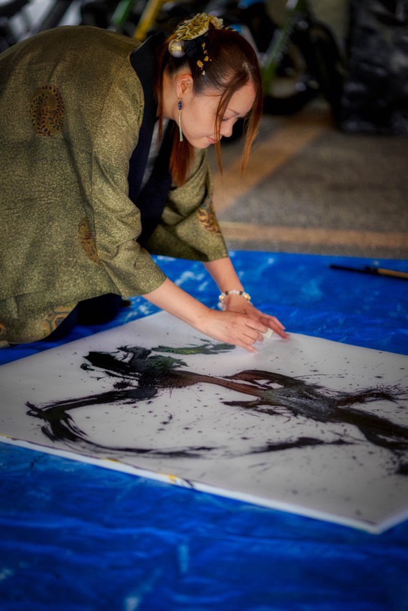 前衛書道は、文字の可読性を超えた、空間・時間性の抽象芸術であろうとする美へのあくなき挑戦。同じ表現は2度とできない唯一無二の作品。書家の呼吸、無音の中でかく集中力、筆の流れに是非注目して下さい。