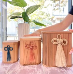 低コストの県産杉の棺おけ、国産杉の骨壺も一緒に展示!