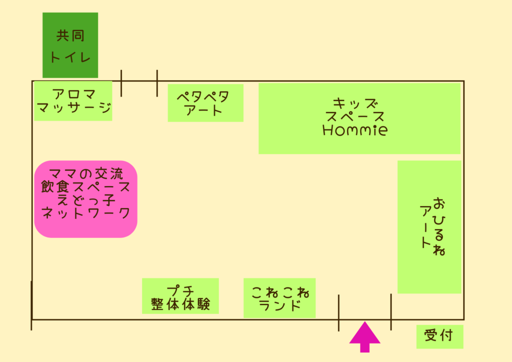 こちら ① おひるねアート ② ぺタぺタアート ③ 【キッズスペース】キッズ花花 ④ こねこねランド ⑤ アロママッサージ ⑥ プチ整体体験 ⑦ ミニコンサート ママの交流スペース(飲食OK)